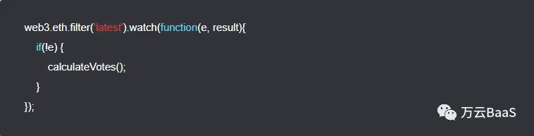 最后,为了累计所有的投票,我们需要查看合约事件,以及投票内容。为了完成这些工作,在我们实例化“ethervote”后我们需要去运行这个函数一次来查看事件: