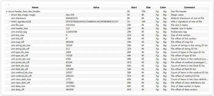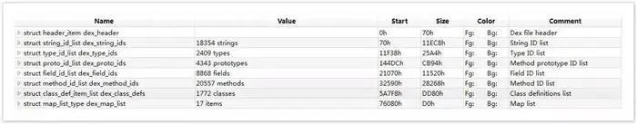 map_list 里先用一个 uint 描述后面有 size 个 map_item,后续就是对应的 size 个 map_item 描述。 map_item 结构有 4 个元素: type 表示该 map_item 的类型,Dalvik Executable Format 里 Type Code 的定义; size 表示再细分此 item,该类型的个数;offset 是第一个元素的针对文件初始位置的偏移量; unuse 是用对齐字节的,无用。
