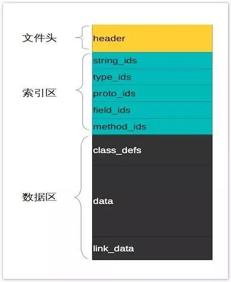 dex 文件可以分为3个模块,头文件(header)、索引区(xxxx_ids)、数据区(data)。头文件概况的描述了整个 dex 文件的分布,包括每一个索引区的大小跟偏移。索引区表示每个数据的标识,主要是指向数据区的偏移。