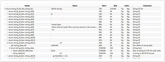 其中 data 保存的就是字符串的值。string_ids 是比较关键的,后续的区段很多都是直接指向 string_ids 的 index。在写工具进行比较的时候也需要提取到 string_ids。