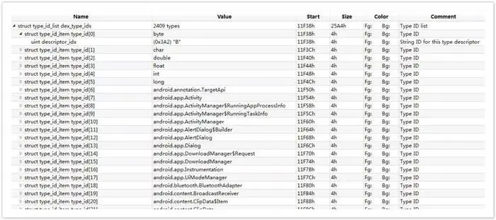 type_ids 区索引了 dex 文件里的所有数据类型,包括 class 类型,数组类型(array types)和基本类型(primitive types)。区段里的元素格式为 type_ids_item