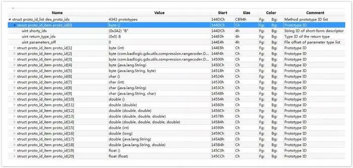proto 的意思是 method prototype 代表 java 语言里的一个 method 的原型 。proto_ids 里的元素为 proto_id_item