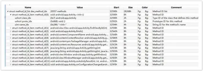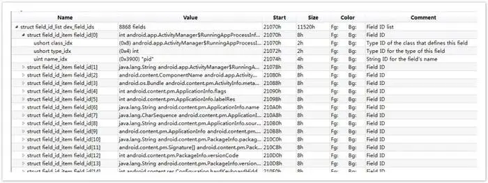 filed_ids 区里面有 dex 文件引用的所有的 field。区段的元素格式是 field_id_item,结构如下: