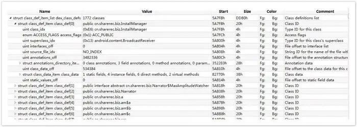 class_def -> class_data_off 保存了具体类定义的偏移地址,也就是 class_def -> class_data 的地址,如果该值为0则所有实现将被隐藏。隐藏后会把类定义的所有东西都隐藏包括成员变量,成员函数,静态变量,静态函数。