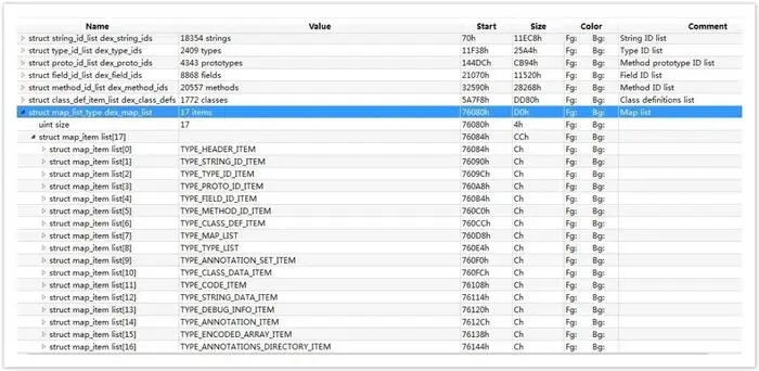 map_list 中大部分 item 跟 header 中的相应描述相同,都是介绍了各个区的偏移和大小,但是 map_list 中描述的更加全面,包括了 HEADER_ITEM 、TYPE_LIST、STRING_DATA_ITEM、DEBUG_INFO_ITEM 等信息。