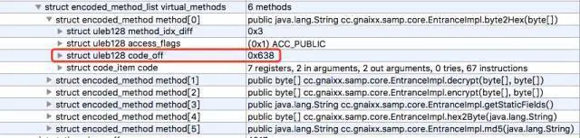 class_def -> class_data -> virtual_methods -> code_ff 表示的是某个类中某个函数的代码偏移地址。这里需要提到一个概念:Java 中所有函数实现都是虚函数,这一点和 C++ 是不一样的,所有这里修改的都是 virtual_methods中 code_off。