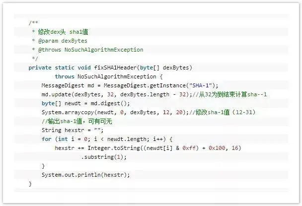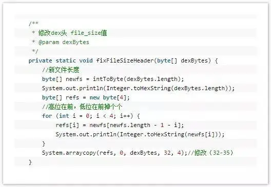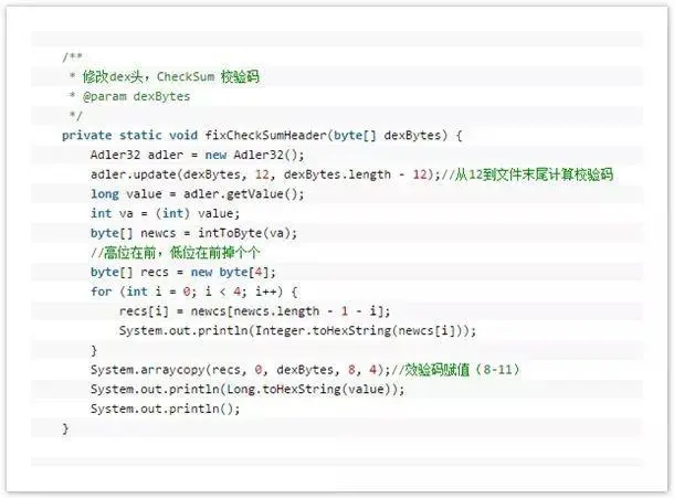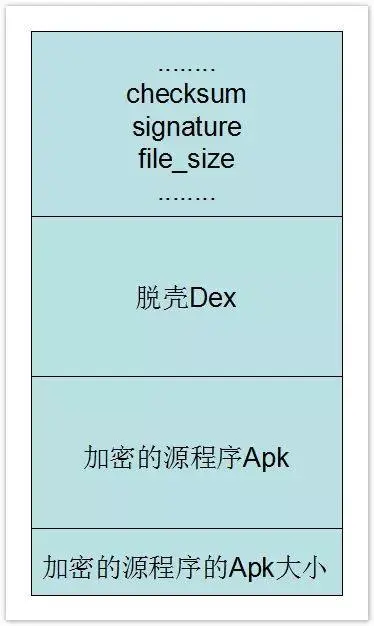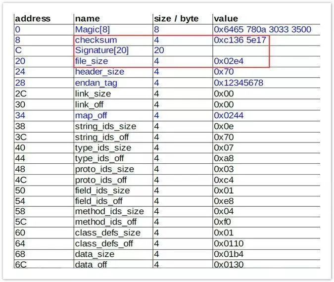 因为将一个文件(加密之后的源Apk)写入到Dex中,那么肯定需要修改文件校验码(checksum).因为他是检查文件是否有错误。那么signature也是一样,唯一识别文件的算法。还有就是需要修改dex文件的大小。