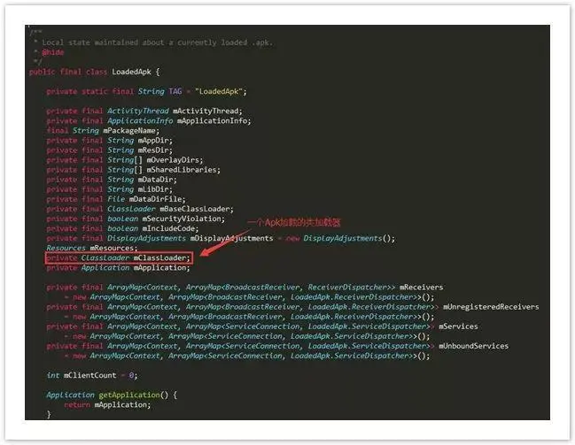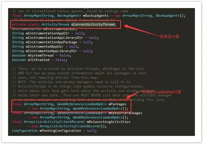 内部有一个mClassLoader变量,是负责加载一个Apk程序的,只要获取到这个类加载器就可以了。他不是static的,所以还得获取一个LoadedApk对象。再去看一下另外一个类:ActivityThread.java的源码