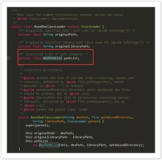 PathClassLoader和DexClassLoader类的父加载器是BootClassLoader,他们的父类是BaseDexClassLoader。里面有一个DexPathList对象,在来看一下DexPathList.java源码: