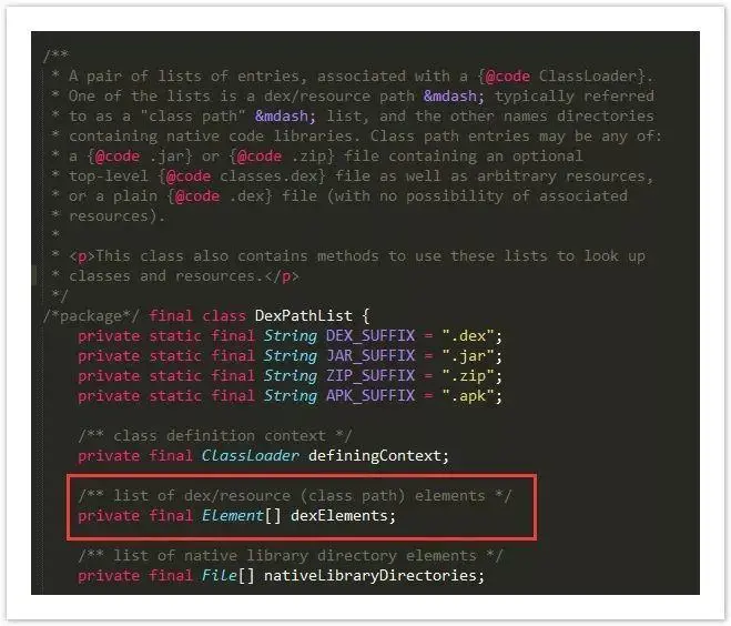 首先看一下这个类的描述,还有一个Elements数组,这个变量是专门存放加载的dex文件的路径的,系统默认的类加载器是PathClassLoader,一个程序加载之后会释放一个dex出来,这时候会将dex路径放到里面,