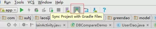 4)执行Sync Project with Gradle Files 。根据以上配置,下载和引用GreenDAO的类库。