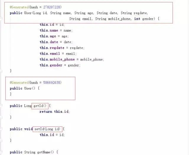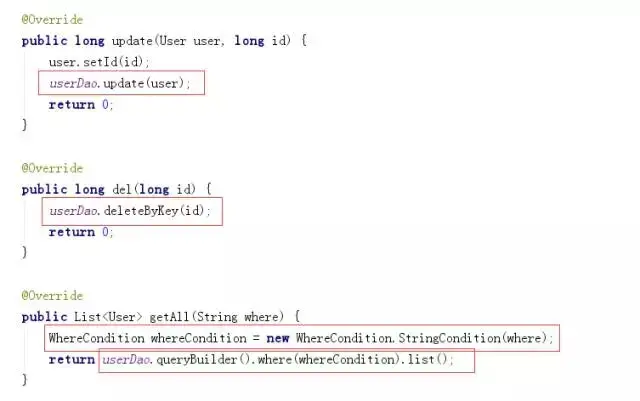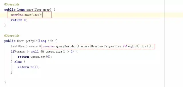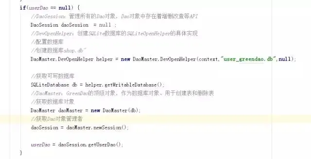 7)针对User类的数据库操作类也已经自动生成了。它就是 UserDao 。获取UserDAO需要用到DaoSession 和DaoMaster。通过以下步骤获取UserDAO。以此类推通过定义 Xyz类的JavaBean就可以自动生成 XyzDao。