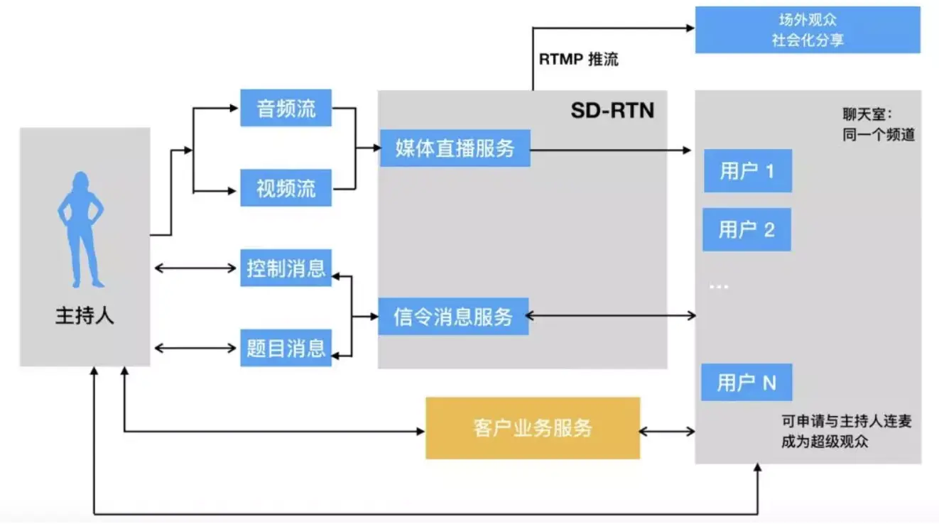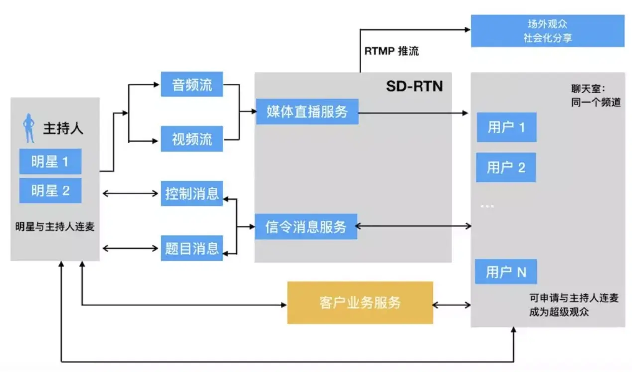 亦或者,高级用户(明星)可以通过连麦加入主持人房间,与主持人进行实时音视频互动PK,并同步直播给终端用户。给被淘汰的用户一个继续观战的理由。