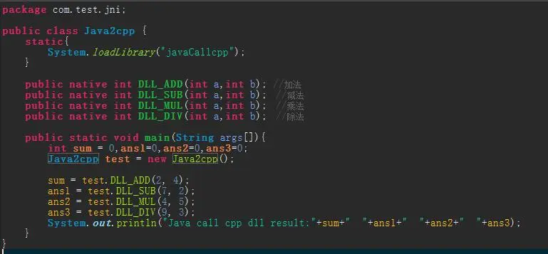 如上图,其中注意这句System.loadLibrary("javaCallcpp ");,这就是加载dll文件的代码了。然后我们需要dll中实现下面定义的加减乘除方法。