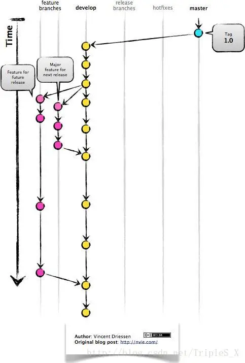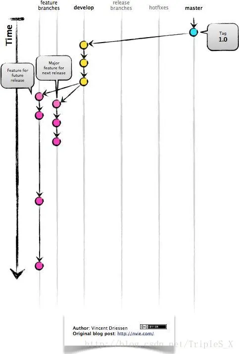 - 发布阶段:当一个新 feature 开发完成的时候,它会被合并到 develop 分支,这个分支主要用来暂时保存那些还没有发布的内容,所以如果需要再开发新的 feature,我们只需要从 develop 分支创建新分支,即可包含所有已经完成的 feature 。