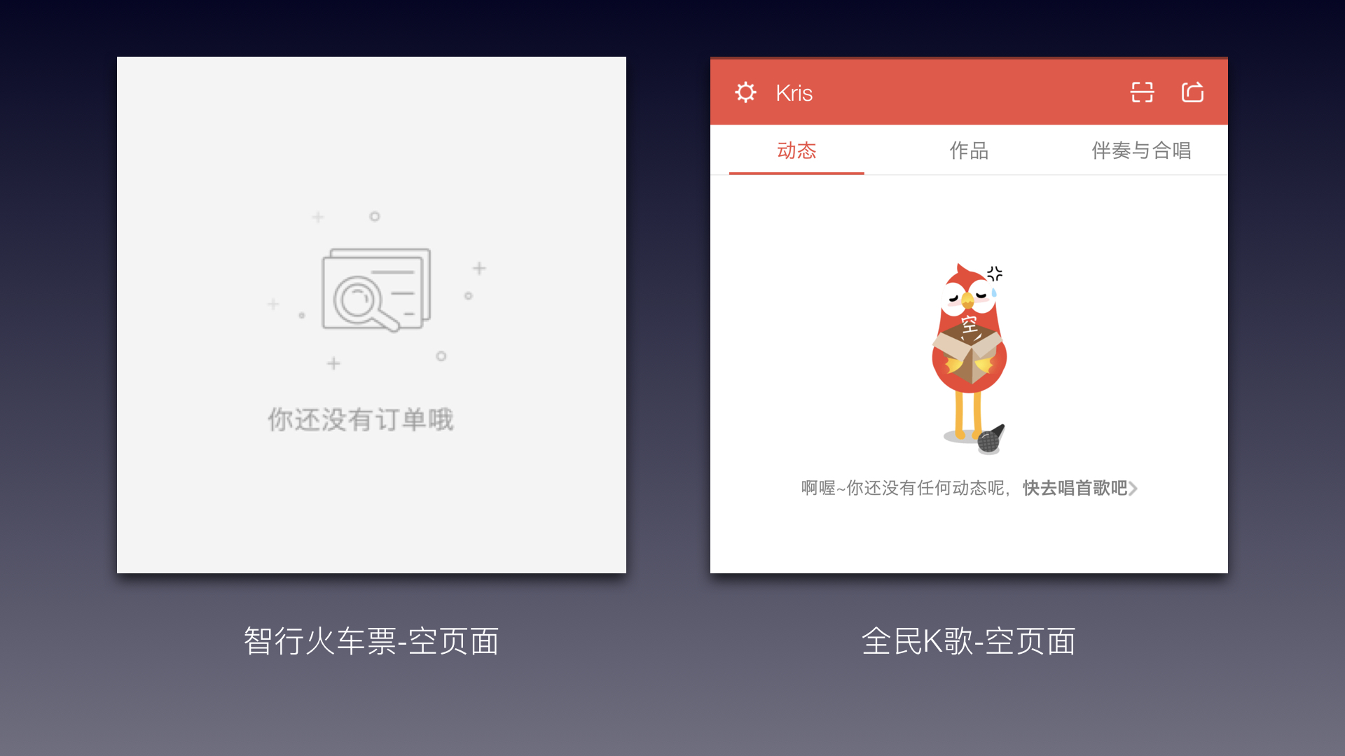 全民K歌:图片用吉祥物表达空数据时的愤怒、焦躁心情;俏皮的文案,指引用户去唱歌,点击可直接进入录制歌曲模块,快捷入口又可以提升唱歌模块的活跃度。