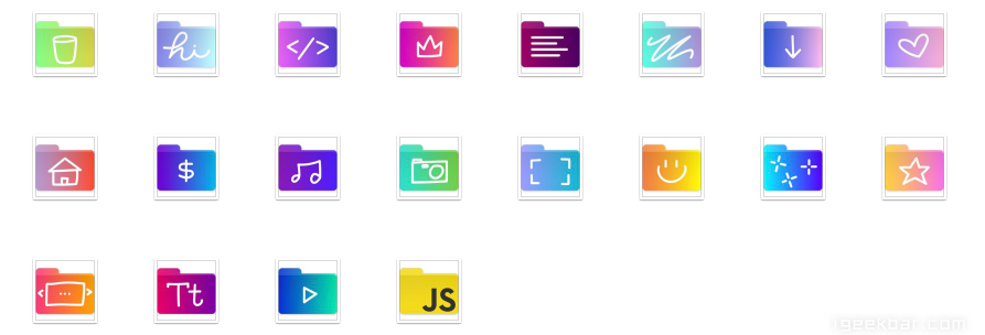 今儿个小编在逛tympanus的时候,看到一组超级超级漂亮的渐变文件夹!又长知识啦哈哈哈~ ~ ~玩儿了十几年的电脑,居然不知道原来文件夹还能自定义图像!于是就迫不及待的给自己电脑的文件夹全都穿上了个衣服hiahiahia~~~再也不用看着同样枯燥的蓝色文件夹图标啦~ ~真的真的超赞!!来来来,在此跟大家分享分享,喜欢的小伙伴儿快快动起手来,也来为你的文件夹装饰一下吧 ~ ^_^ ~