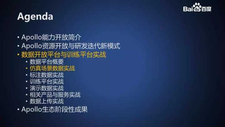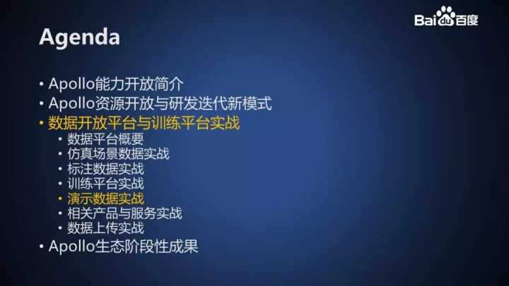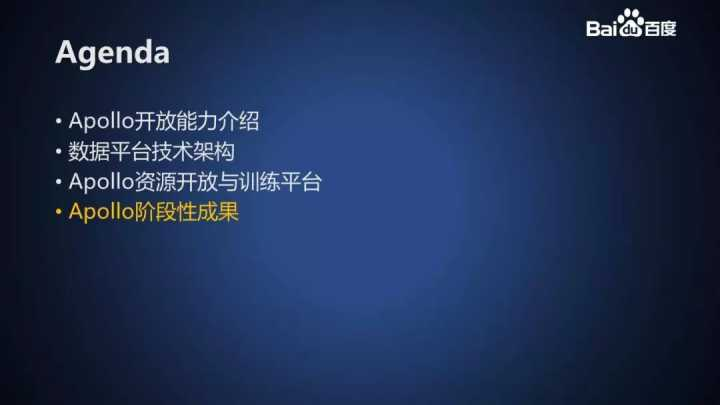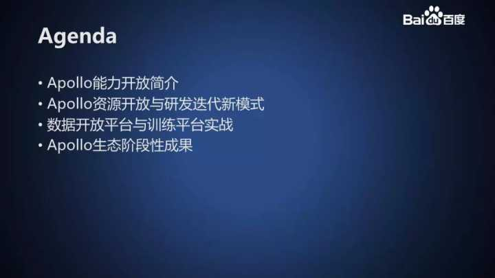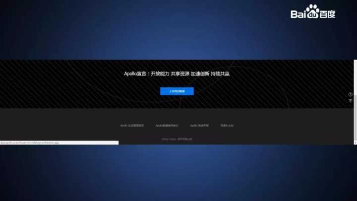 自 4 月 19 号宣布开放后,收到很多伙伴的反馈,其核心总结为 Apollo 宣言。自动驾驶行业正在快速走向未来,而最大的痛点在于技术壁垒太高,每个企业需要技术与人力的多年积累,才可以进入实质的研发。百度起步较早,有将近 4 年的技术积累,投入较早,将把能力开放给每一个合作伙伴,从 0 到 1,很快进入到无人驾驶的研发,从而提高无人驾驶行业的创新速度,避免重复造轮子。大家都把精力放在更有效的创新上。共享资源,合作伙伴使用 Apollo 技术资源,拿来即用;同时,每个合作伙伴,都可以贡献资源,贡献得越多,得到的越多。Apollo 受益,合作伙伴更受益。加速创新:数据加创新,汇集数据资源,公里数,覆盖的场景数,以后将远远大于任何一个封闭的体系持续共赢:百度的商业模式,基于百度的核心能力。能力与合作伙伴互补,Apollo 将是汽车工业的里程碑,Apollo 将产生核心的影响力。