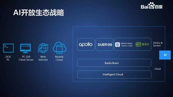在这个新移动时代手机有很强的感知能力,有更多的 AI 基产能力,每个手机都能听、能看、能说、能学习、能懂用户。百度的核心产品,手机百度,爱奇艺等等,将充分利用这新的能力,全面推进新的技术和产品来引领新一代的移动时代的用户体验。特别是手机百度,手机百度将把搜索和个性化有机融合在一块,打造新一代的更懂用户的体验。Apollo 生态是百度 AI 重要的、最先落地的生态之一。
