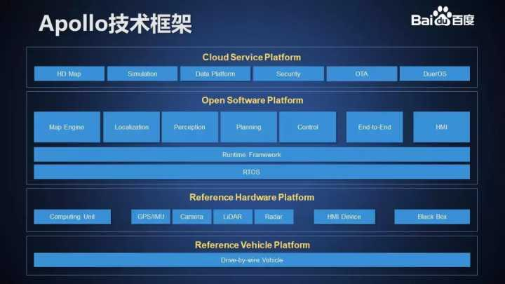 开放的框架是学术界、科技界、产业界的共同需求。Apollo 技术框架由 4 层构成。分别是