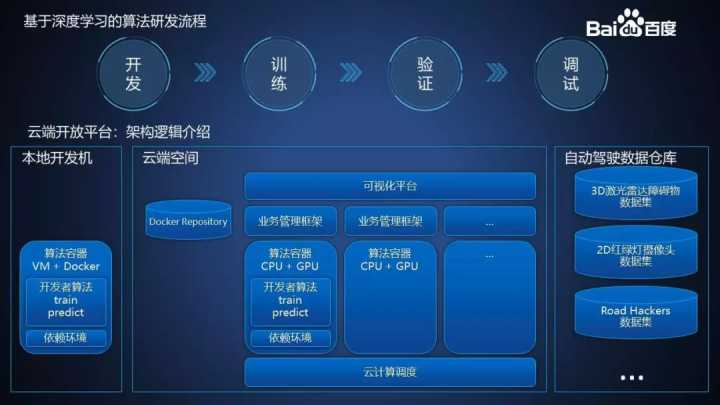 我们在自动驾驶的算法开发中,最大的痛点之一就是需要对海量数据集,反复尝试。我们通过将深度学习算法的研发流程 (开发、训练、验证、调试) 在云端实现,可以在充分利用云端大量计算资源的同时,将数据的流动仅在云端的服务器内完成,从而大幅提高算法研发效率。