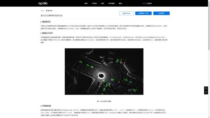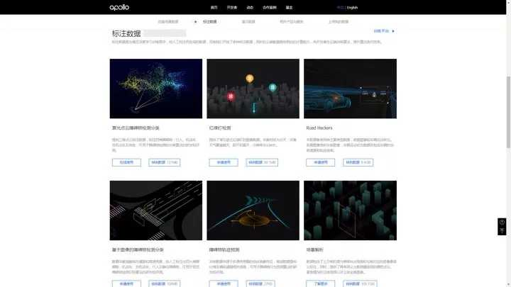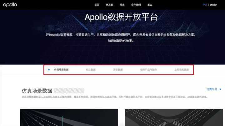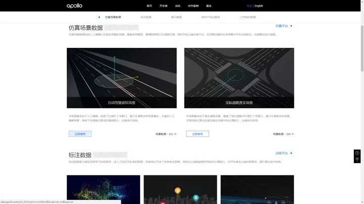 数据开放平台的首页由几个小节构成,分别是仿真场景数据、标注数据、演示数据、相关产品与服务、上传我的数据。