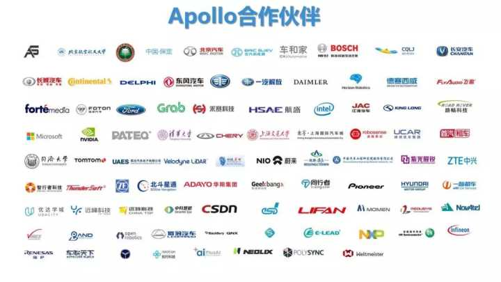 Apollo 已经有 90 家合作伙伴,其中有超过 15 个汽车厂商(13 家国内自动品牌和 2 家海外品牌);博世、大陆、德尔福等 10 家一流 Tier1 供应商;包括英特尔、英伟达在内的一流芯片厂商;地图公司如 Tomtom;Velodyne、速腾、禾赛等激光雷达公司;地平线、智行者等创业公司;首汽约车、Grab、神州优车等出行服务公司;清华大学、同济大学等高校研究机构。