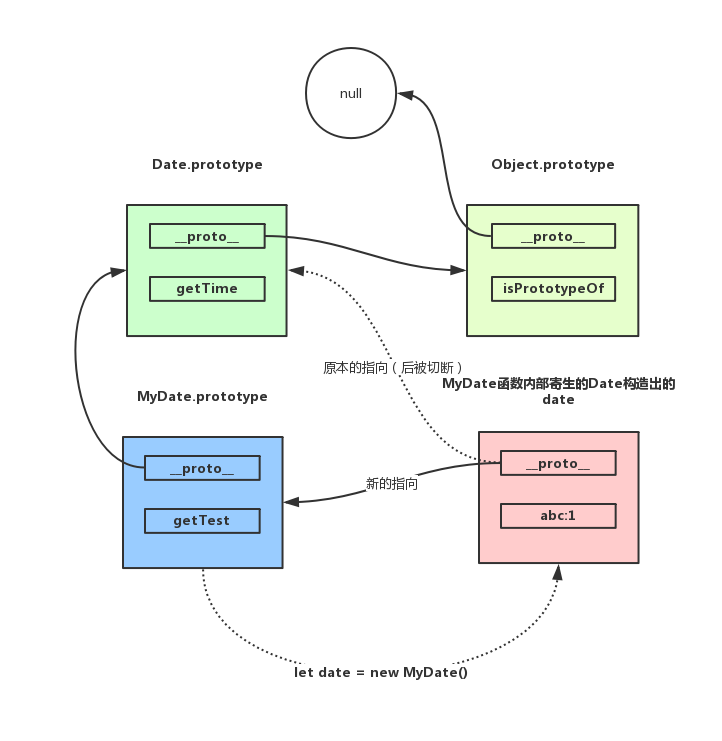 我们可以看到instance的最终指向的原型是MyDate.prototype,而MyDate.prototype的构造函数是MyDate, 因此可以认为instance是MyDate的实例。