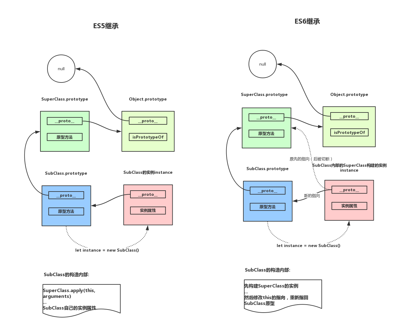 SubClass.prototype)指向父类原型(SuperClass.prototype) -