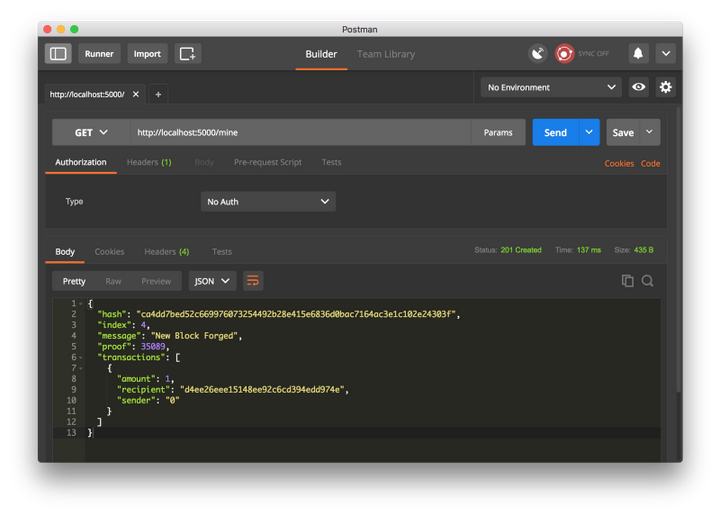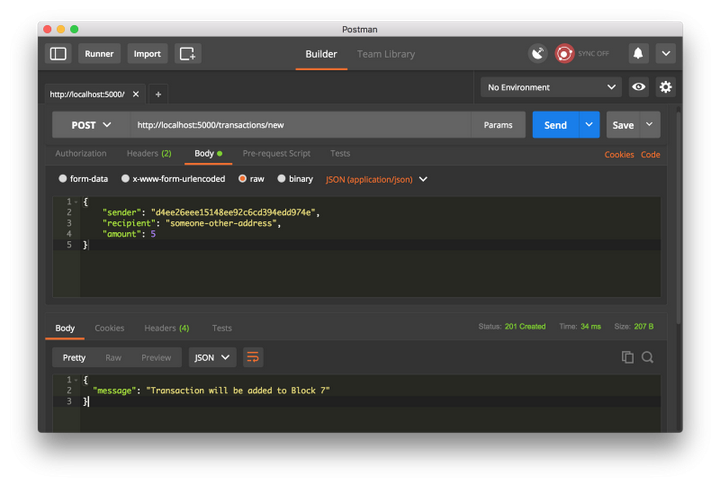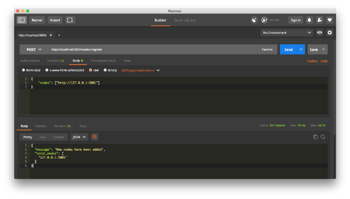 在这一点上,如果你喜欢,你可以使用一台不同的机器,并在你的网络上启动不同的节点。 或者使用同一台机器上的不同端口启动进程。 我在我的机器上,不同的端口上创建了另一个节点,并将其注册到当前节点。 因此,我有两个节点:http://localhost:5000 和 http://localhost:5001。 注册一个新节点: