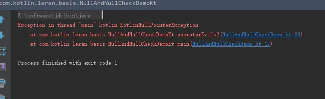!!操作符可谓是给爱好空引用异常(NullPointException)的开发者使用,因为在使用一个可空类型变量时,在该变量后面加上!!操作符,会显示的抛出NullPointException异常