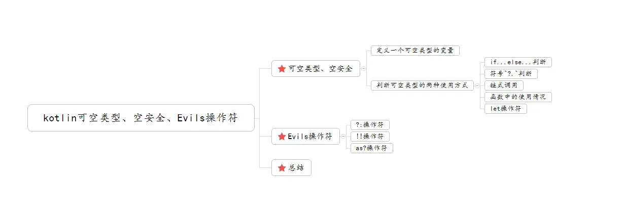 ?:这个操作符表示在判断一个可空类型时,会返回一个我们自己设定好的默认值.!!这个操作符表示在判断一个可空类型时,会显示的抛出空引用异常(NullPointException).as?这个操作符表示为安全的类型转换.