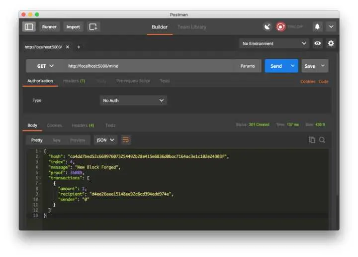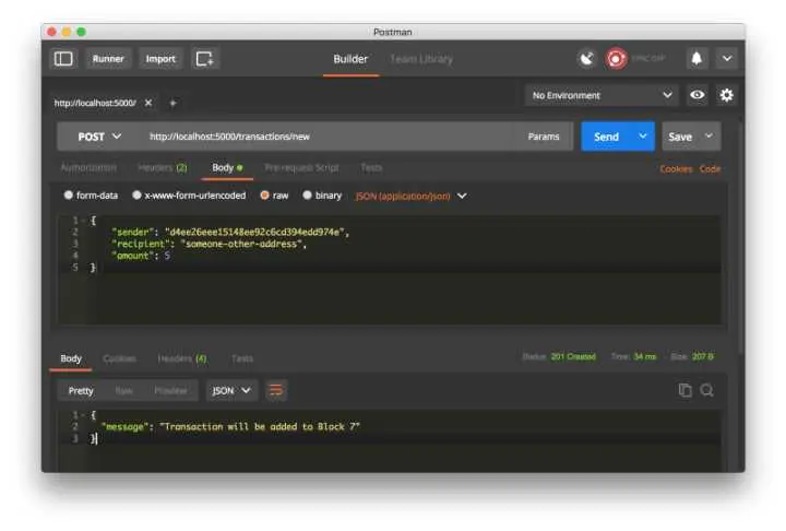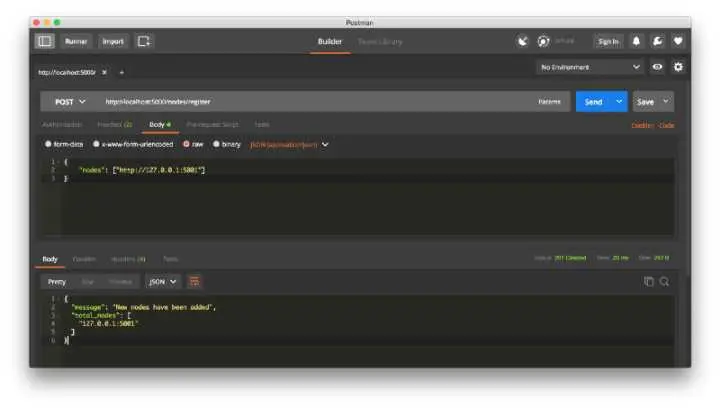 在这一点上,如果你喜欢,你可以使用一台不同的机器,并在你的网络上启动不同的节点。 或者使用同一台机器上的不同端口启动进程。 我在我的机器上,不同的端口上创建了另一个节点,并将其注册到当前节点。 因此,我有两个节点:http://localhost:5000 和 http://localhost:5001。 注册一个新节点: