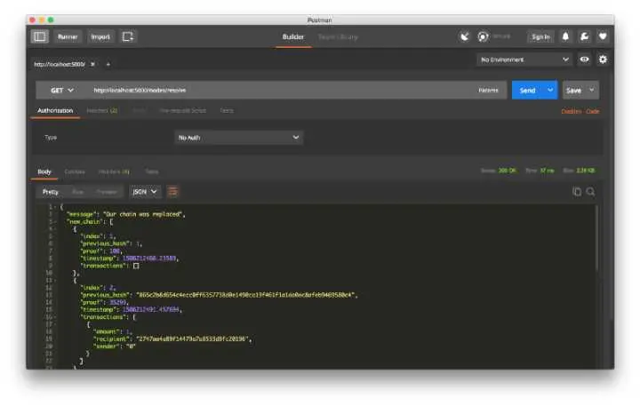 然后我在节点 2 上挖掘了一些新的块,以确保链条更长。 之后,我在节点1上调用 GET /nodes/resolve,其中链由一致性算法取代: