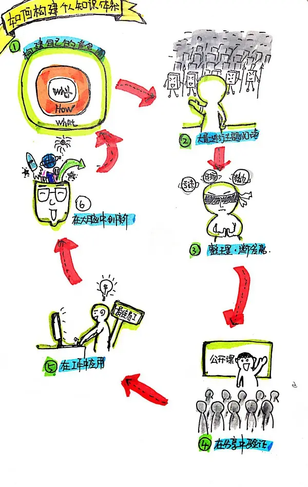 平时在各个网站会遇到一些好文章,基本上都是收藏不看型(反正我基本是这样o(╯□╰)o)。但是如果有了这个思维导图框架,我们就可以把哪些好文章分门别类的放在某个相关主题下,方便以后的整理归纳。对于前端领域,深感知识更迭速度之快。所以对于已经过期的,果断抛弃。经过慢慢的沉淀,留下的才是真正的精华。这其实也就是图中的2,3步。