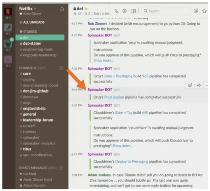 Netflix 最开始是用邮件通知构建发布的结果,后来发现邮件根本没人看,于是 Spinnaker 和 Slack 做了集成,任何发布消息都会推送到 Slack 的群聊里。好处是如果有人工的决策点需要审核,在 Slack 里可以得到及时的通知。