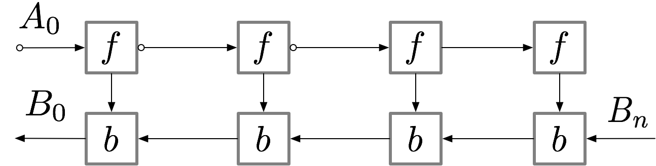对一个简单的 n 层前馈神经网络,获取梯度的计算图如下所示: