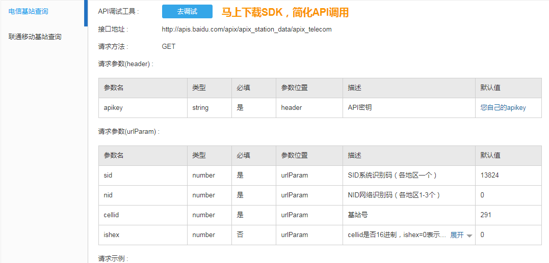 随意在网上搜索公共API服务,比如下图中的百度基站查询的接口。