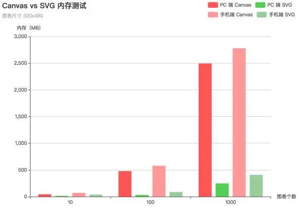 新增的SVG渲染方式,在内存占用方面有很好的表现,以折线图、柱状图、饼图为例,SVG渲染占用的内存是Canvas渲染的十分之一。这意味着,对于移动端场景,尤其是配置较为低端的安卓手机而言,在原先使用Canvas会造成卡顿甚至页面崩溃的情况下,SVG也能顺滑地完成渲染工作。