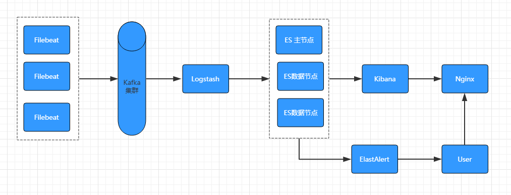 ELK技术栈(即Logstash + ElasticSearch + Kibana)属于业界已经应用比较广泛且成熟的开源方案,这套一站式解决方案基本上可以满足大部分企业对日志管理体系的需求。我们即选择ELK作为日志收集方案,其架构如下: