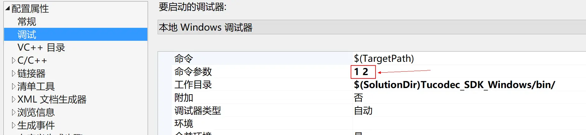 4、在vs中点击“本地调试器”即可运行本demo,main函数的两个参数已在工程配置选项中赋予,如图5所示