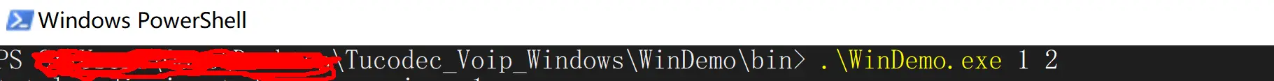或者手动将opencv和Tucodec_SDK_Windows的bin目录下的文件拷贝到exe所在的目录。然后在该文件夹下打开“命令提示符”或者“Windows PowerShell”,在命令行下面赋予WinDemo.exe两个参数,分别是自己的ID和对方的ID,然后运行即可。如图6所示