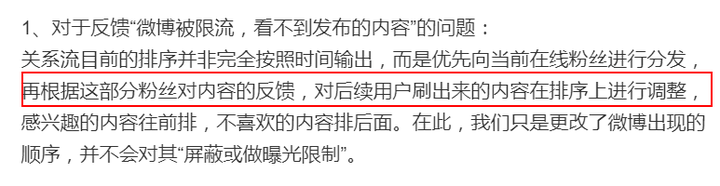 在这条微博中我们可以看到,微博限流竟然是针对用户对其关注内容的反馈来作出的的所谓“优化",那么很多像社长酱这样不去点赞,不去评论甚至不去转发的人而言,我们的主页岂不是一团糟?