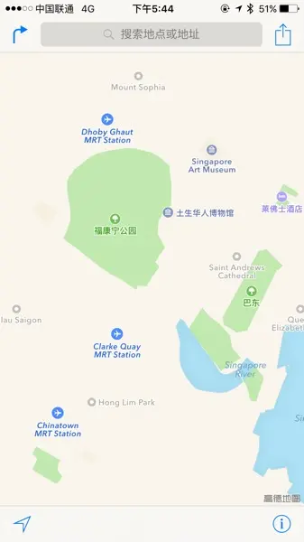 如果手机在大陆地区,iOS地图使用的是高德地图数据源:此时用户查看大陆和港澳台地图细节信息时,使用的是GCJ02火星坐标系,同时地图显示精度很高,但是看海外地图时,由于数据源问题精度就会很差(坐标系是WGS84),例如下图看新加坡,如果你要在地图中显示POI打点,效果可想而知。