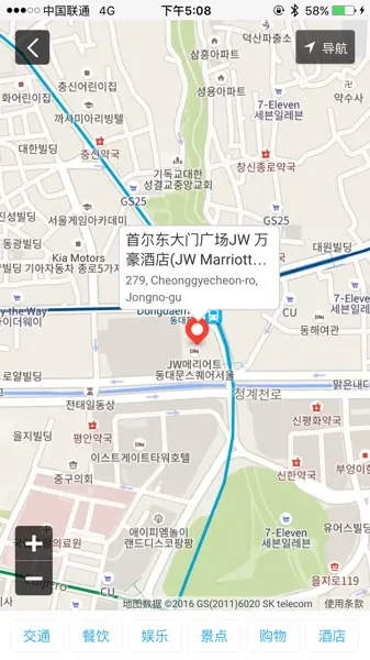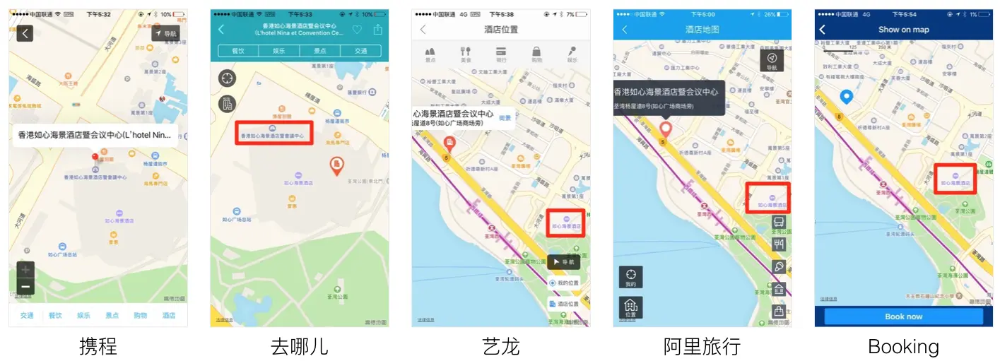 因此要想在iOS地图中正确打点,就需要先行判断使用的地图数据源,以及对应的坐标系,同时使用的POI坐标系务必与地图坐标系匹配,否则就会出现偏差。下图是旅行类App显示香港一家酒店的POI打点,可以看出除了携程外其他App都有偏差,其中三家偏差的方式还是一样的,原因应该是他们服务端仅保存了这家酒店的WGS84地球坐标系坐标。