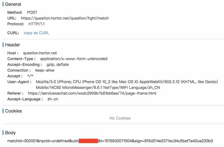 先从接口看一下,这是一个非常顺畅的游戏流程,但是拿到这些接口我就可以开始为所欲为了吗?显然是不可能的,如果每个人都能有权限肆意使用别人的接口的话,岂不是可以很轻松的做到DDoS攻击或者很轻松地获取到自己想要的信息了吗?对于一家有经验的公司来说显然是不会犯这种错误的,那么我随便拿一个接口来稍作分析。