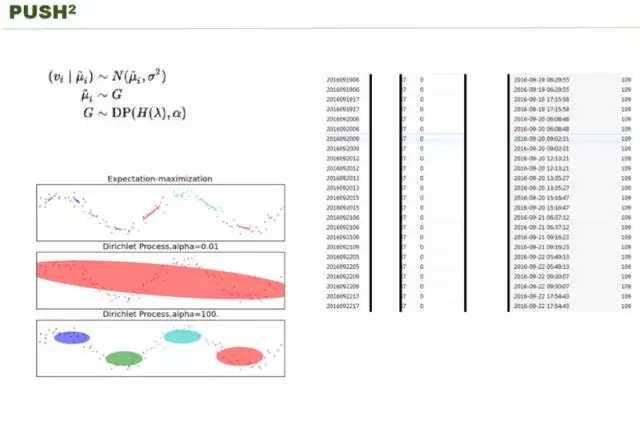 这里需要引入一个模型,就是我们之前在学习的时候不知道 push 几次,什么时间 push,这个可能 deep learning 并不能很好的告诉我们。我们假设一个场景,一个学生,这个学生每天使用手机的一个集中时间段是哪里?可能是早上起来,如果他觉得课无聊的会刷一下,中午刷一下,下午他大把的时间他会刷,他社交娱乐的时候就不刷了,这是学生。上班族肯定是早上刷、中午刷,下午忙工作,晚上一直在刷,这是上班族。这几类人都是不同的画像,怎么获取每个人会有几个频繁刷的中心点,他们有大半的时间刷这个东西,只要刷手机的中心点 push 就可以了,因为他们不会反感,不要在学生上课,上班族开会的时候给他 push。你怎么通过用户的历史行为得到它这几个时间点?刚才我举了两个 case,有的人可能是说我一天刷三次,有人刷六次,有人刷七次,如果你要通过传统的聚类技术来做的话,普通的聚类技术必须实现设定好 K 是多少,要聚多少类,一定要设定好,不同用户其实 K 是不一样的。我们一开始把所有的数据送到 deep learning,让它给我们选 K,但是我们发现基本上都会过拟合。很多同学可能用过 LDA,LDA 比较好的地方是其中用到了共轭,它二项式分布跟狄利克雷的分布过程是共轭的。
