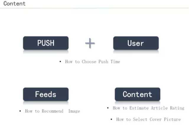 如何选择合适的推送时间?这需要跟特定的用户关联起来。还有 feeds,如何给用户推荐图像,就是图像的推荐是比较难做的,因为图像本身如果没有文字描述,你怎么去推荐?里面有很多的 feature 需要抽取。还有内容,内容怎么建模,怎么去评价一篇文章或者一个媒体内容,如何评估一个媒体内容是优质的还是劣质的。如果刷新 APP 的时候看到一些劣质内容、一些广告和一些营销性的内容、排版错乱的文章,那么用户体验就很差了。在做一些阅读 APP 的时候,要有方法对它评级。