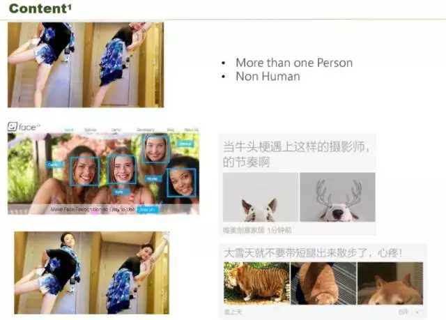 图片会影响文章的点击率。左上角是一个明星,这是我们竞品的效果,把明星的头截掉了,在 APP 展示的时候没有显示出头像,这种图大部分用户都不愿意去点,因为眼睛都没有,不知道是谁。这种可以通过什么方式解决呢?通过人脸识别可以解决,人脸库识别出来,就可以解决了,形成了左下的图。如果是多个人呢?每个角落都是人,大合影,人脸识别就选不出来了。第二个如果不是人呢?你看右边这个狗,这是它实际截的两个图,你可以看到狗都没有截出来,左下是一个动物也没有截出来,右边的秋田犬也只露出一个头,眼睛没有,这种文章你基本不会点。
