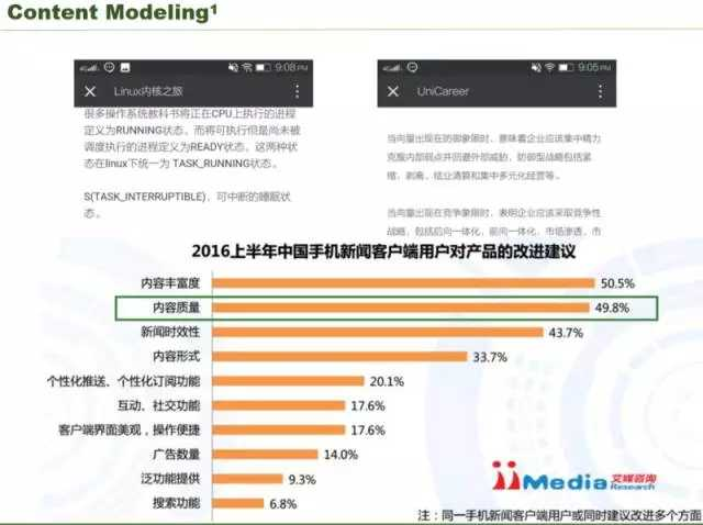 媒体的内容,我们希望看到的是更多比较高质量的内容。我们看这两个内容,左边是技术类,右边是金融方面的文章,从排版和格式来看,大家更愿意阅读哪一个?更愿意阅读第二个。左边虽然是技术方面的,右边的给你阅读感受更好,所以它的质量是更高的,这里需要给内容进行评级。这里艾媒传媒的一个数据,2016 年中国手机新闻客户段用户对产品的改进建议,其中内容质量占比很高,有接近一半的用户他觉得 app 的内容质量非常低,经常给他推送一些质量低的内容。